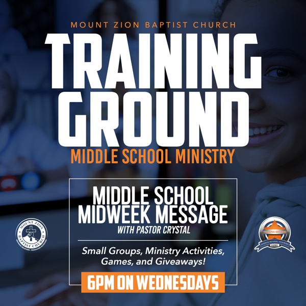 Join the Training Ground Middle School Ministry Virtual Small Group Meeting every Wednesday at 6pm. The Middle School Group includes children grades 5th - 8th. Zoom ID: 706 237 1841. Code: 611641.