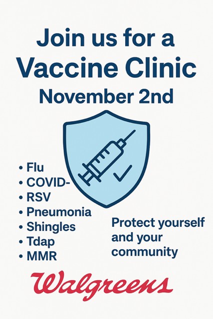 We are excited to announce our partnership with Walgreens to provide a convenient Community Vaccine Clinic! Protect yourself and your loved ones by getting vaccinated against several preventable illnesses. Available vaccines include: Flu, COVID-19, RSV, Pneumonia, Shingles, Tdap (Tetanus, Diphtheria, and Pertussis), and MMR (Measles, Mumps, and Rubella). Take a step toward better health—join us and stay protected this season! Meet us in the Fellowship Hall downstairs.